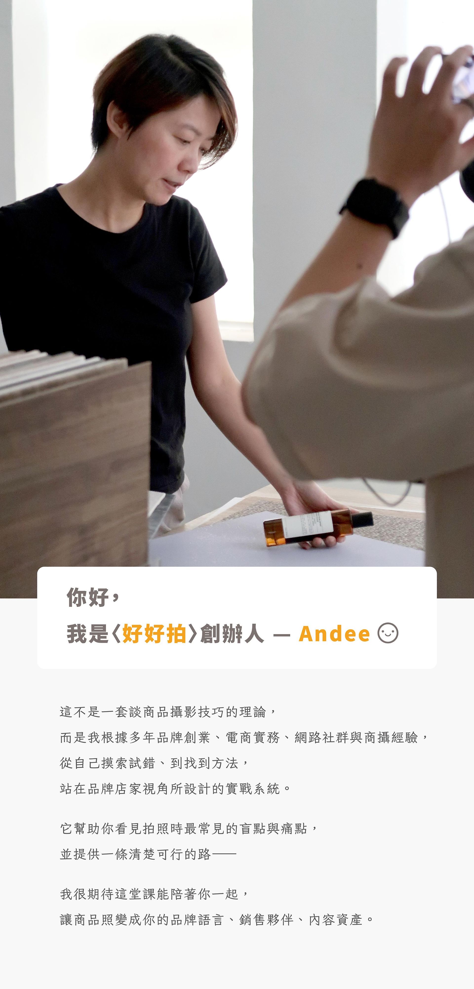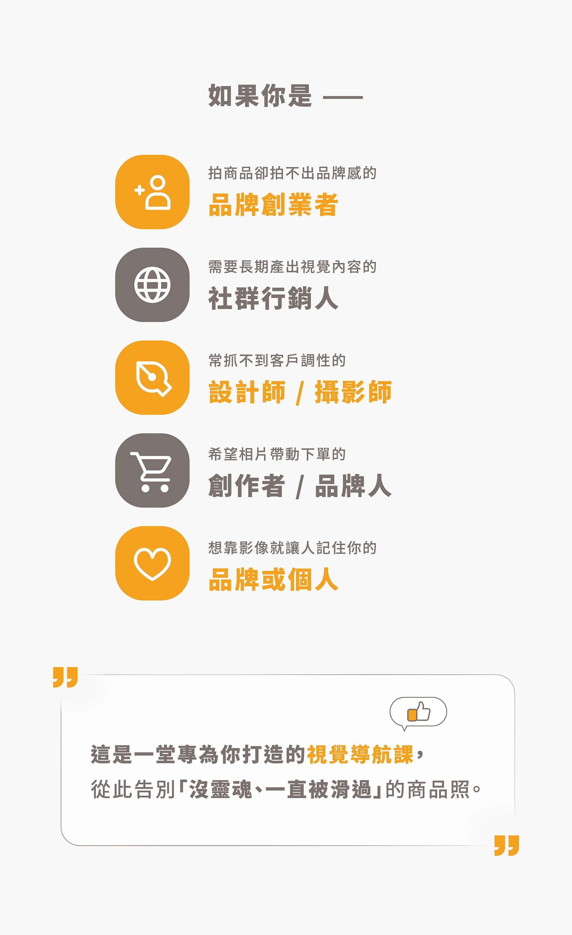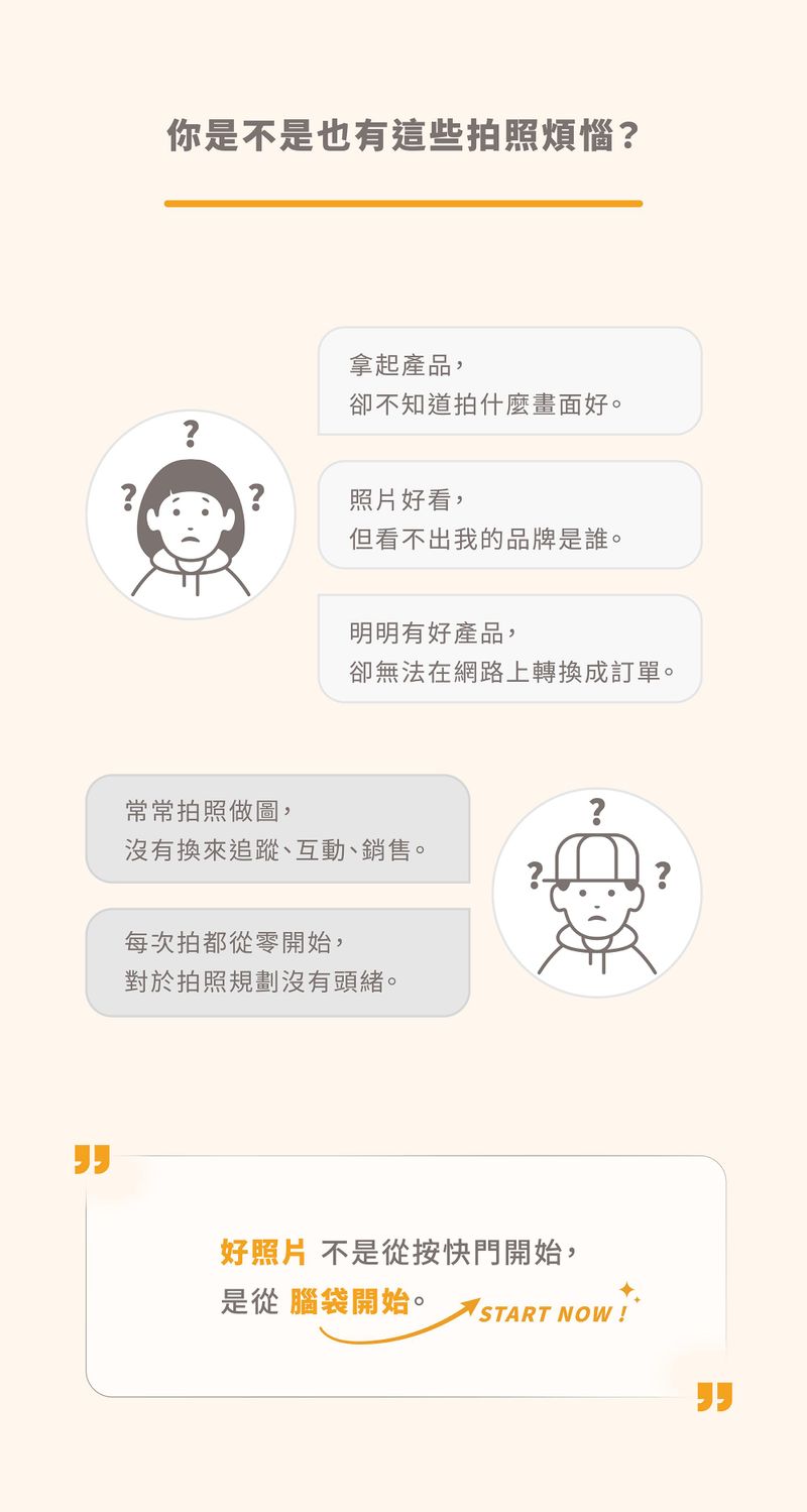 本課程以分享「按下快門之前」的品牌視覺思考規劃為主,若你也想了解如何用「手機+自然光」拍攝商品照、商品攝影技巧、AI 科技工具的輔助運用等,推薦你加入下列這堂課:
