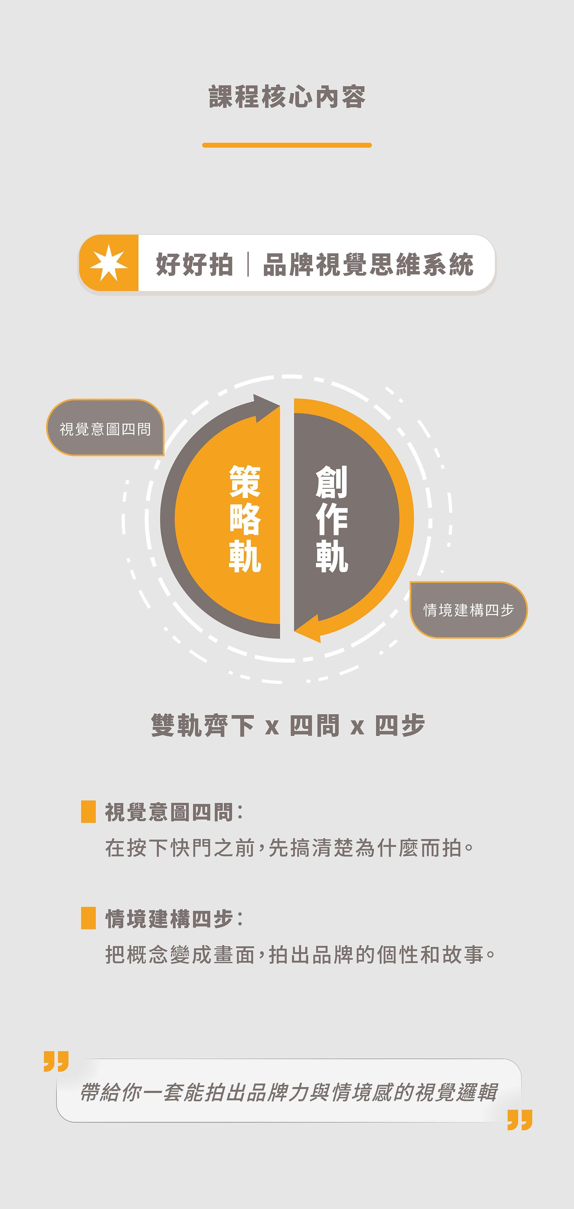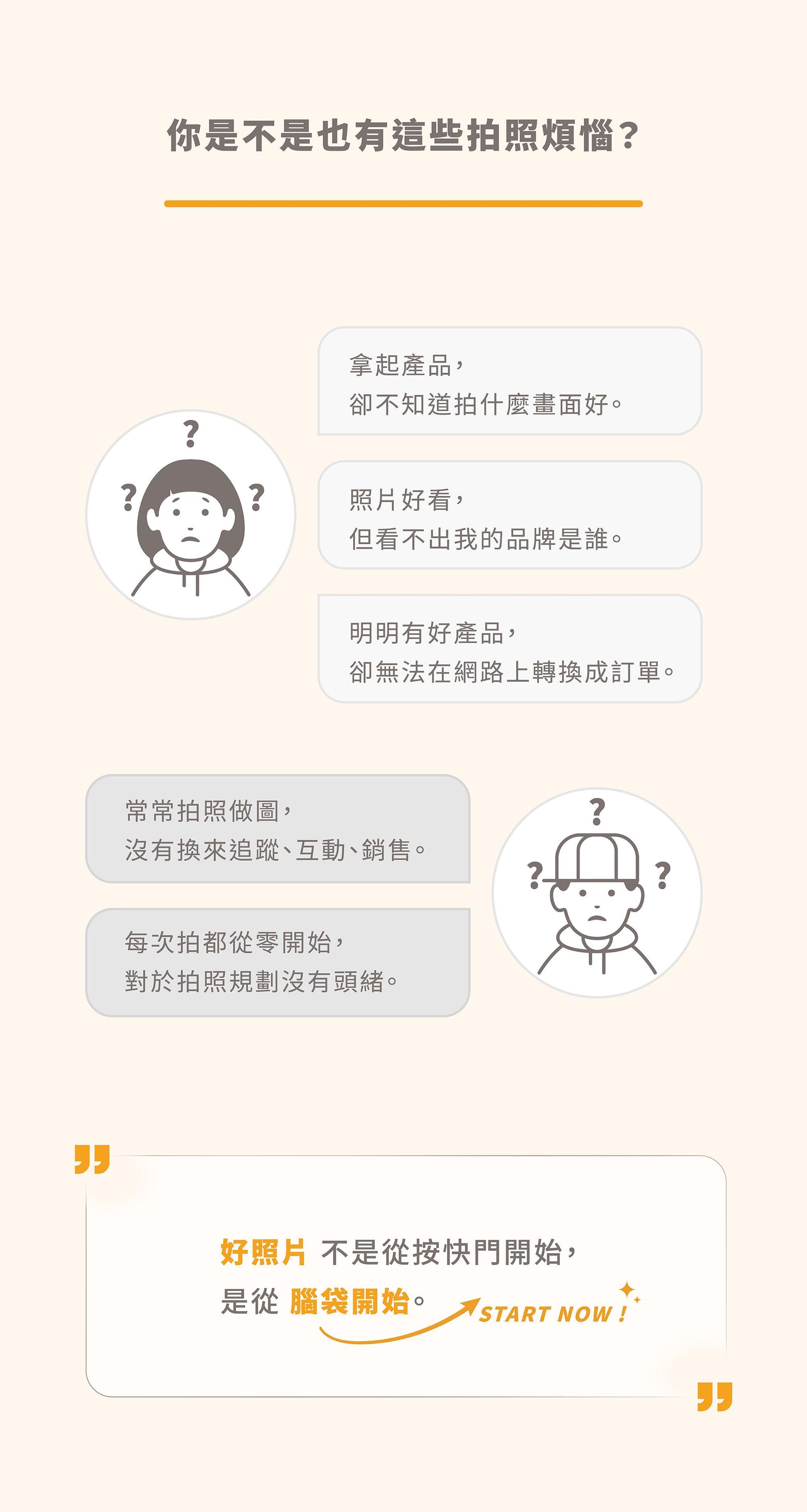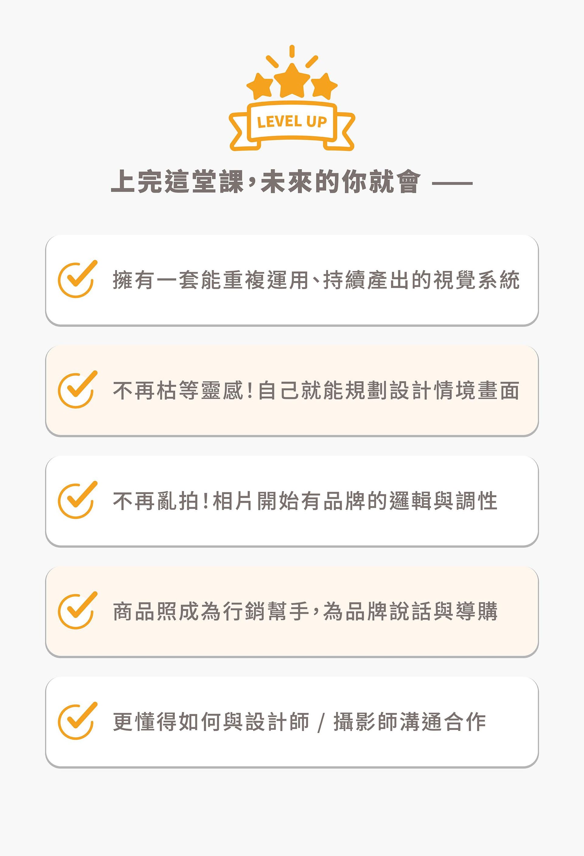 本課程以分享「按下快門之前」的品牌視覺思考規劃為主,若你也想了解如何用「手機+自然光」拍攝商品照、商品攝影技巧、AI 科技工具的輔助運用等,推薦你加入下列這堂課: