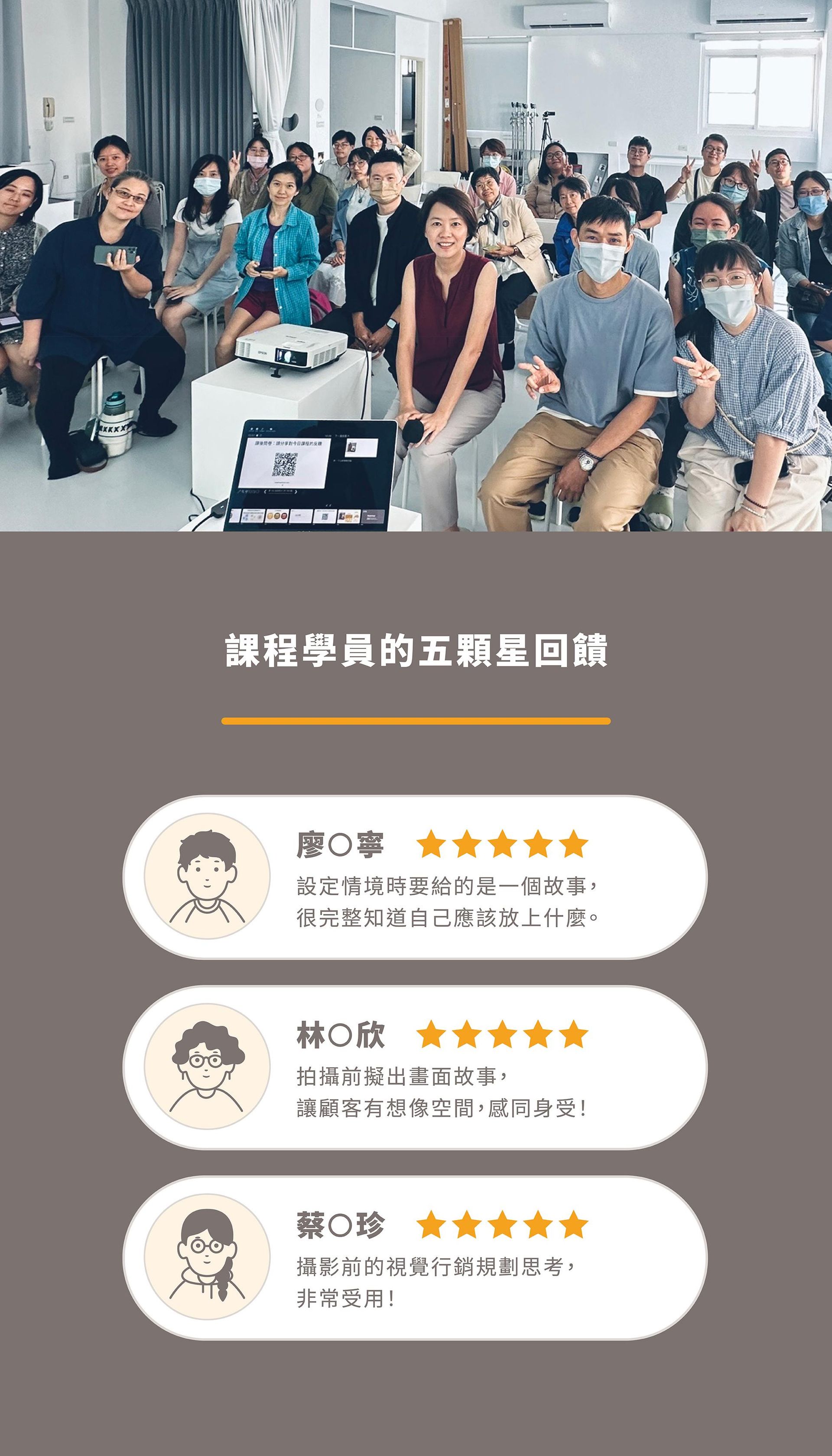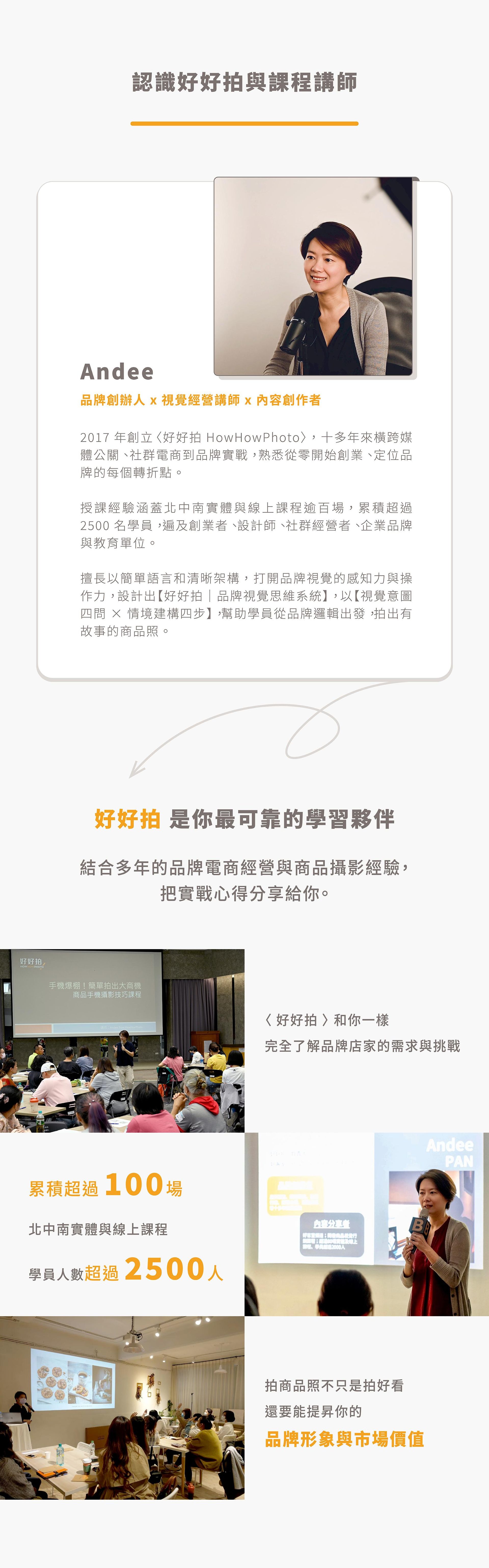 .累積完成超過 100 場課程講座活動,授課學員超過 2500 人,主題包含手機商品攝影、品牌視覺行銷、商品打光等